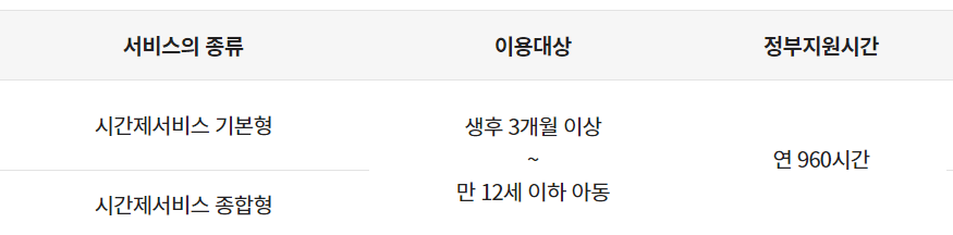 - 시간제 서비스: 생후 3개월 이상부터 12세 이하의 아동을 위한 서비스로, 기본형과 종합형으로 나뉩니다.