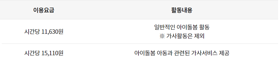 - 영아종일제 돌봄 (시간당 요금: 11,630원, 돌봄수당: 10,110원)