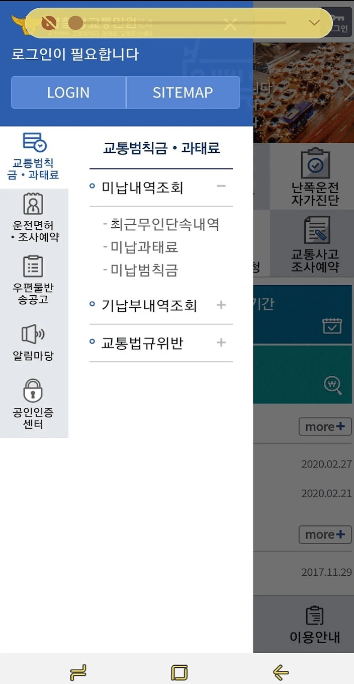 - 이후 교통범칙금, 과태료 탭에서 미납내역조회가 가능합니다.